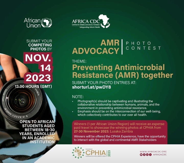 📸 Win at AMR Photo Contest: Organized by Africa CDC, this photo contest is centred on preventing Antimicrobial Resistance. Prizes include an all-expense paid trip to the CPHIA conference in Zambia. For more details, visit the Africa CDC website or view the poster below.